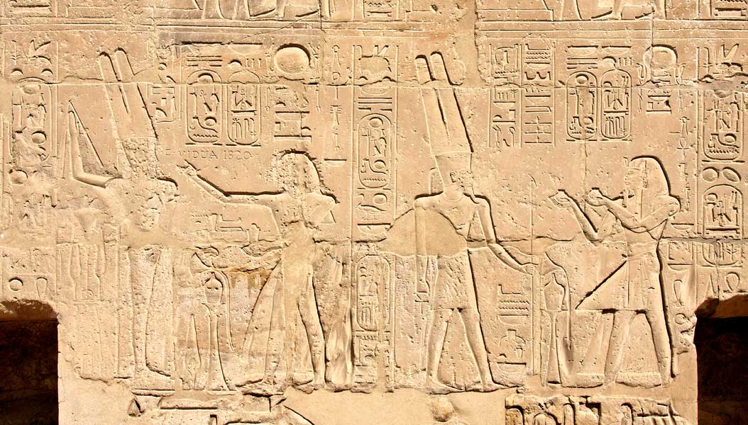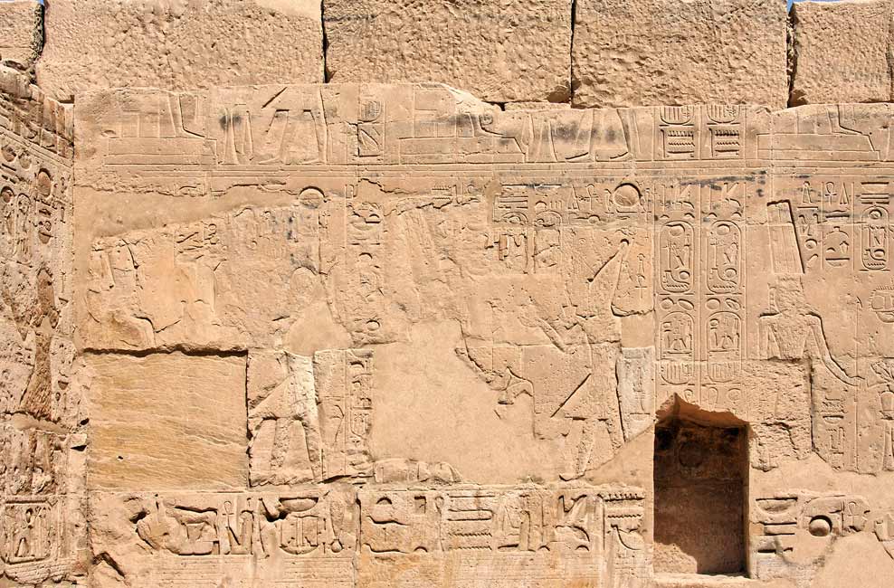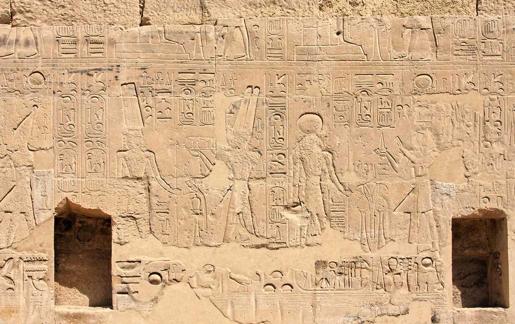 A droite, Ramsès II offre du pain à Rê. A gauche, il offre de la nourriture à Chou, fils de Rê.