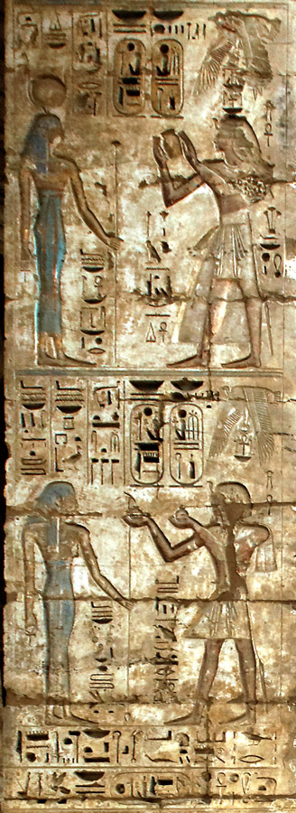 Côté sud : le roi offre le vase Nemset à Isis, la grande, mère du dieu qui lui promet l'éternité.