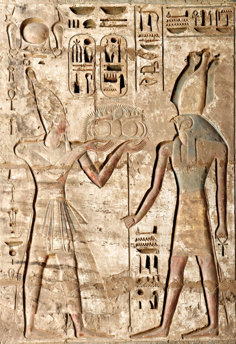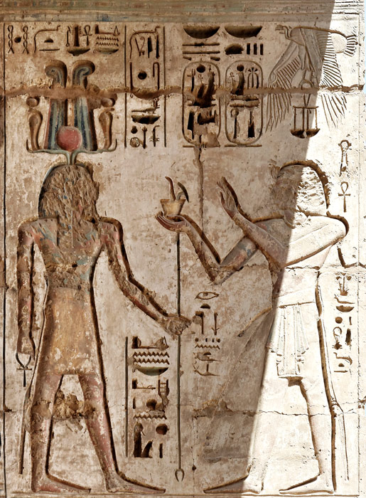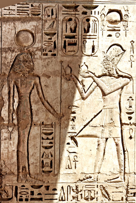 Pilier 44 face sud en haut : le roi fait une offrande de nourriture à Sokar-Osiris qui lui donne la royauté de Rê.