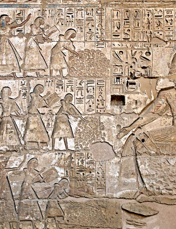 Sur 3 rangées, les scribes comptent les mains coupées aux Libyens morts devant le roi.