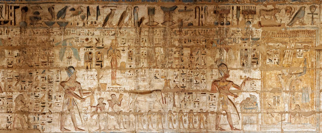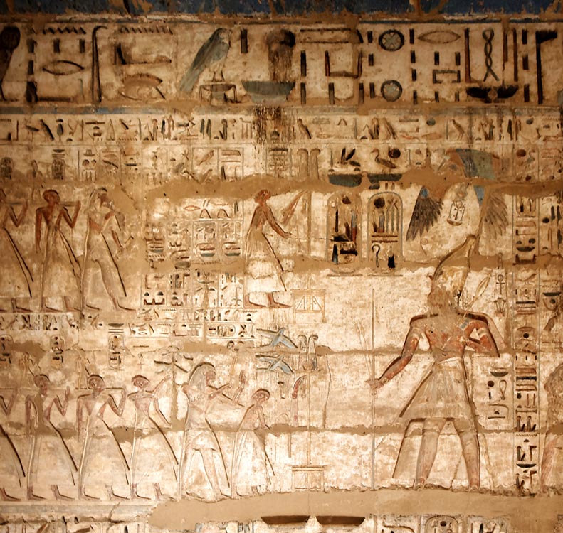 A gauche, le roi accomplit la cérémonie de coupe des gerbes de céréales. Ce rite d'origine agricole fut interprété au Nouvel Empire comme un rite osirien, le roi coupant ainsi symboliquement la tête des ennemis d'Osiris. La grande épouse royale l'accompagne.