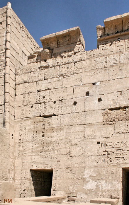 La porte la plus près du 2ème pylône était utilisée également par Ramsès III pour accéder à la cour et y recevoir l'hommage de ses fils qui lui apportaient des bouquets. Au dessus, le calendrier de certaines fêtes agrandi ci-contre. Encore au dessus, la fin des petites scènes vac la scène concernant Sobek-Rê qui est la plus proche du pylône.