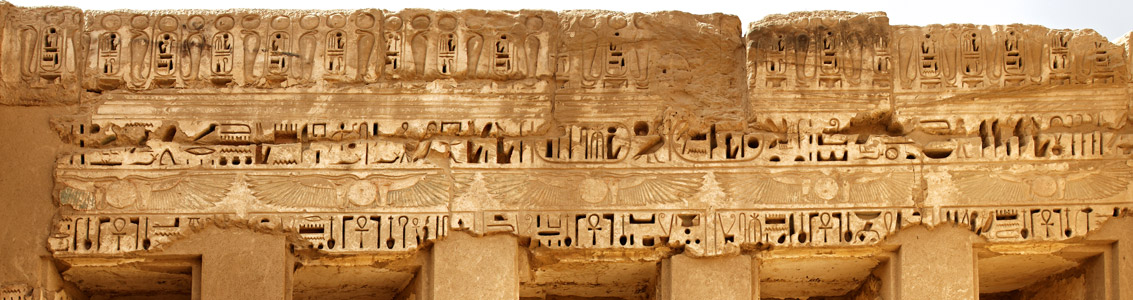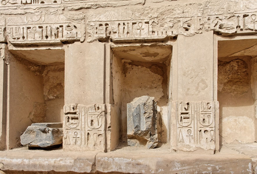 Décoration au-dessus des niches de la paroi Sud : les 9 niches de la salle contenaient une statue d'Amon assimilé au démiurge et les statues des dieux qui étaient censés lui avoir succédé : Geb et Nout, Chou et Tefnout; enfin Osiris accompagné d'Isis et Seth accompagné de Nephtys.