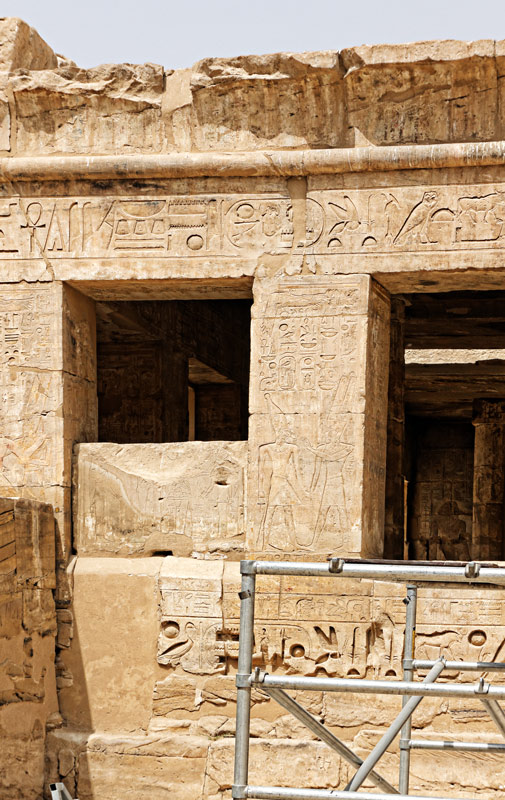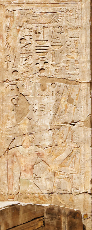 Côté gauche : le bloc entre les 2 colonnes est d'époque saïte (voir ci-dessous). A cette époque, le vestibule était dans l'obscurité : des panneaux avaient été placés entre les piliers à cet effet.