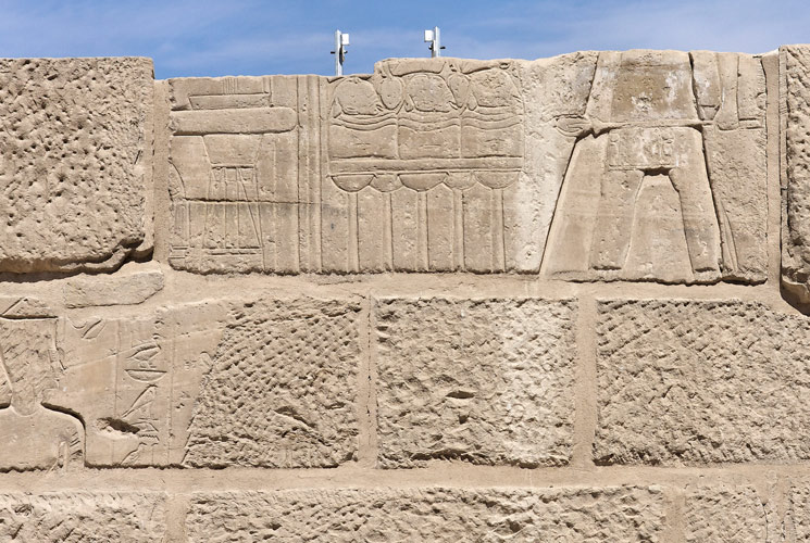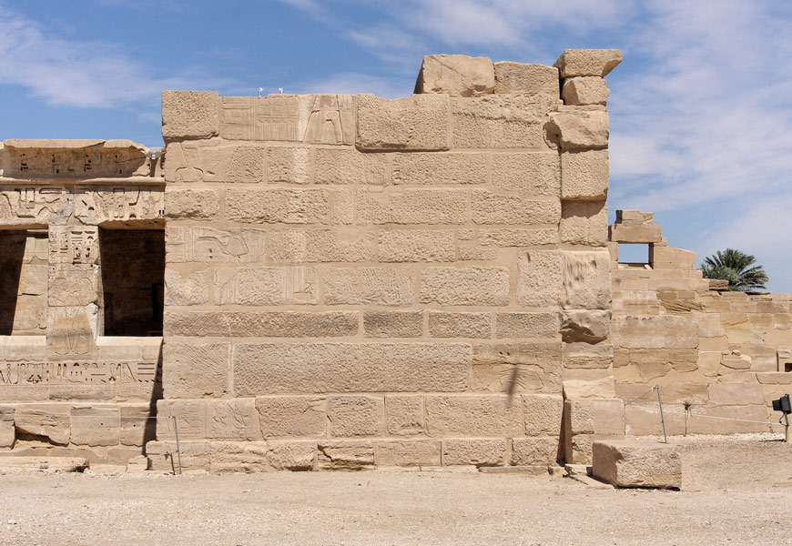 Le mur Sud de cette salle contient de nombreux blocs provenant du Ramesseum et de son Mammisi.