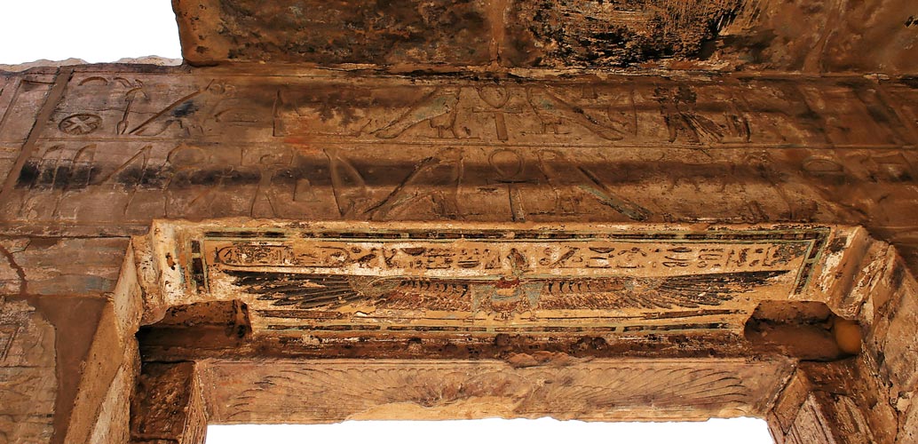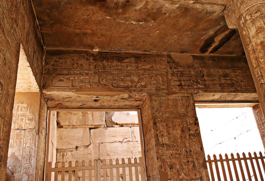 Sur le dessous de la porte Est sont gravées des inscriptions de la période ptolémaïque et sur l'architrave le début de titulatures de Thoutmosis III.