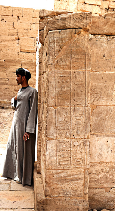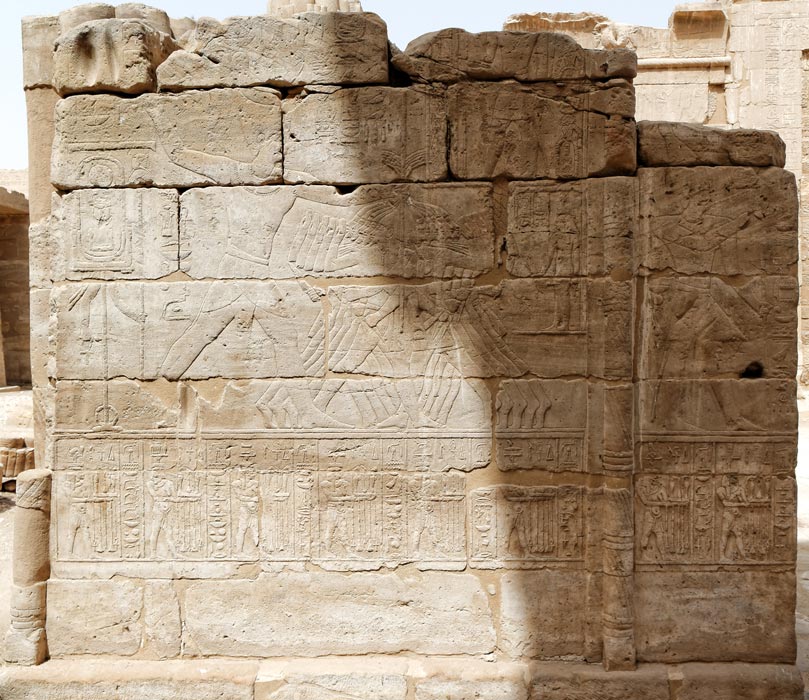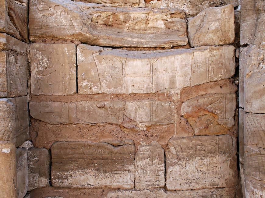 Partie de gauche : ce massif, sorte de petit pylône comporte la fameuse scène du pharaon massacrant ses ennemis. Le roi Nectanebo est suivi de son ka stylisé portant son nom au dessus de sa tête : 'Kheper ka Rê'. Sur le montant de la porte, à droite, le roi fait signe d'entrer, scène classique à cet endroit là. En dessous, une frise de dieux Nil portant des offrandes et représentant certains des nomes de Haute Égypte;