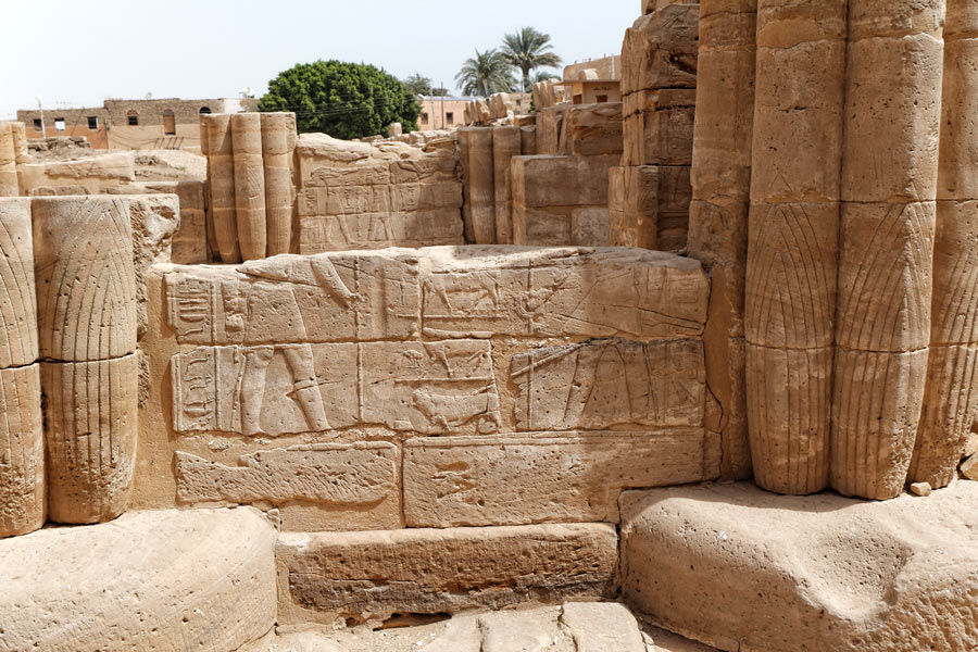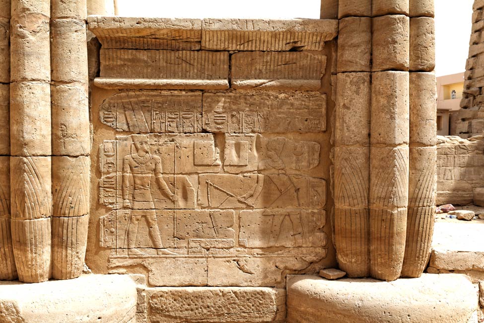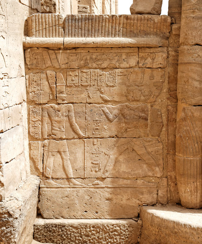 Premier panneau à l'extérieur : le roi Nectanebo conduit 4 veaux vers Amon.