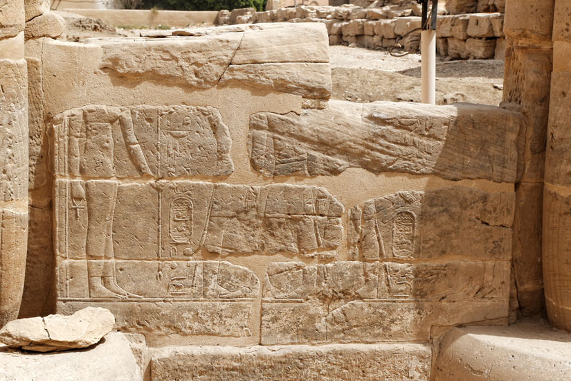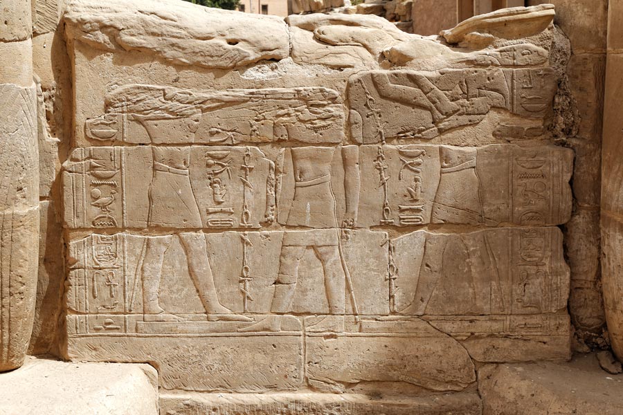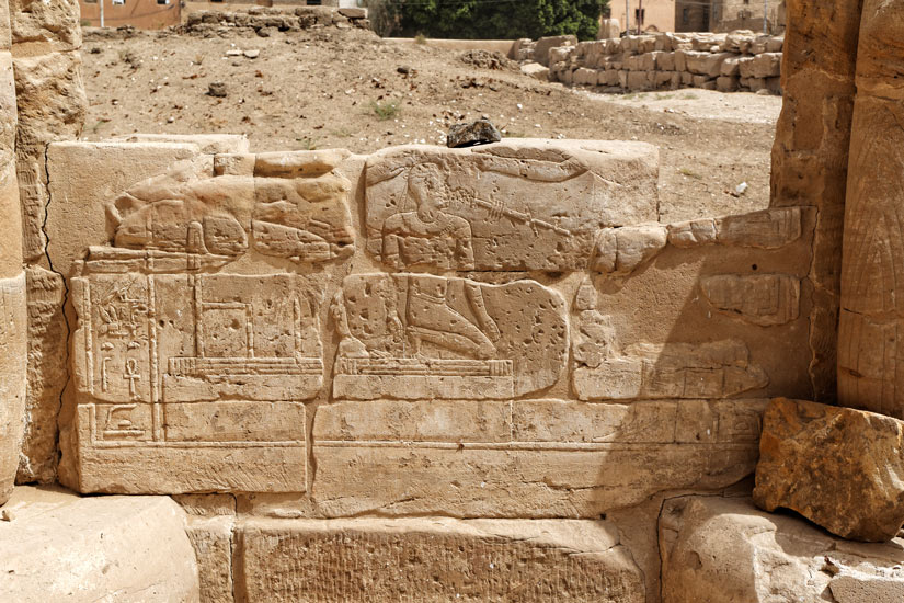 Premier panneau à l'intérieur : le roi Nectanebo (Nekhet nebef) est purifié par Horus et Thot.