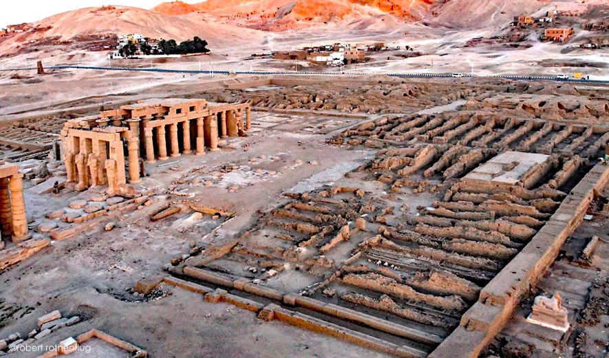 Plusieurs annexes entourent le temple principal. Au Sud se trouvaient une école, l'atelier des artisans et les cuisines. Au Nord et à l'Ouest, 84 magasins occupaient une surface de 15000 m2. Ils contenaient toutes sortes de denrées. Les magasins sont bien alignés. Leur largeur peut être de 3 ou 6 mètres sur une longueur de 54 mètres. Une allée de statues de chacals faisait le tour sur 3 côtés de l'ensemble.
