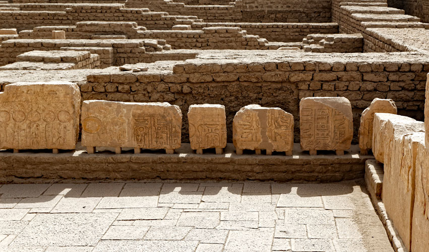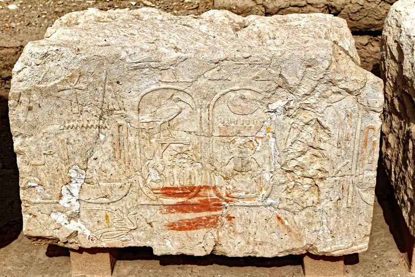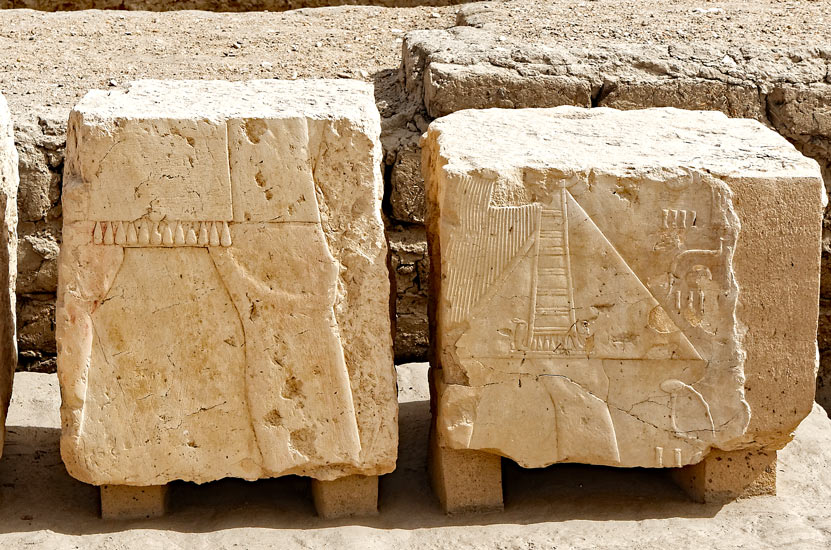 Des blocs inscrits ont été retrouvés sur le site du Ramesseum. Ils sont exposés sur des banquettes.