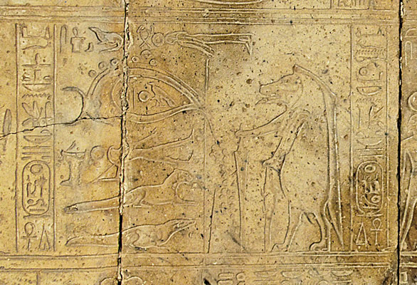 À droite, la déesse Thouèris-Isis correspondrait à la constellation du Dragon. Elle s'appuie sur un pieu, déformation de la cuisse ou Grande Ourse (Mesekhtyou) représentant Seth. A gauche, le dieu An ou Anou est prêt à transpercer avec sa lance le taureau-bulle, autre représentation de Seth-Mesekhtyou dont le nom est inscrit à l'intérieur.
