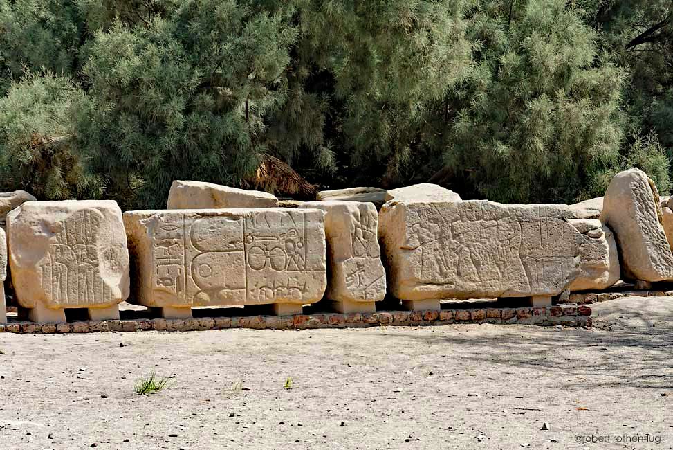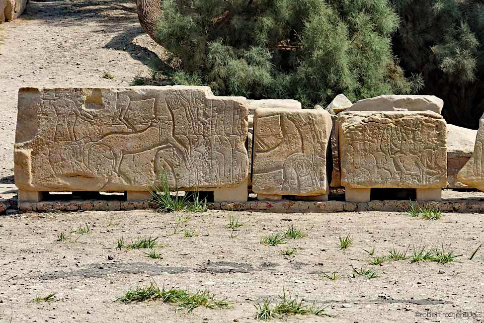 Posés par terre dans la 1ère cour, ces blocs appartiennent très probablement à la partie gauche du pylône. On peut y reconnaître l'arrivée des Na'arins.