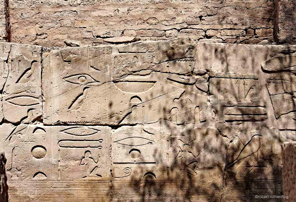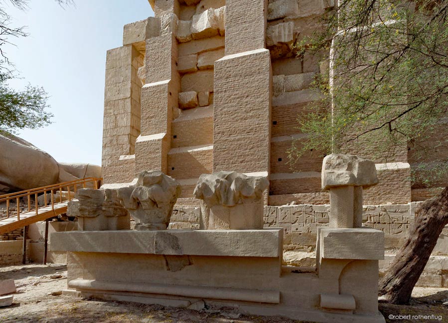 Le second pylône a du être consolidé. Par terre, les restes d'une frise de babouins qui a été récemment découverte. Ces babouins étaient placés en haut du second pylône et adoraient le soleil levant ( voir la même frise dans la 1ère cour, côté ouest, de Medinet Habou. En bas du pylône, on aperçoit les restes du texte dit Le Poëme relatant la bataille de Qadech.