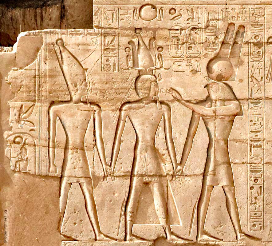 Ramsès est amené par Atoum et Montou vers la triade thébaine à l'autre extrémité du panneau. Cette scène est dite de la "montée royale". Admirez les beaux reliefs en creux, caractéristiques de la seconde manière des temples de Ramsès II après l'an 2 du règne (Vandersleyen, 1995). Cette scène de la montée royale existe au moins depuis Sésostris Ier (Luc Gabolde, dans Le grand Chateau
