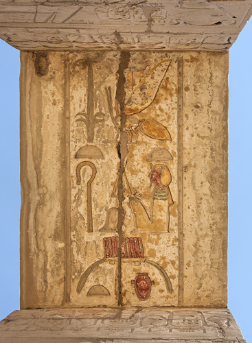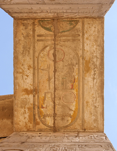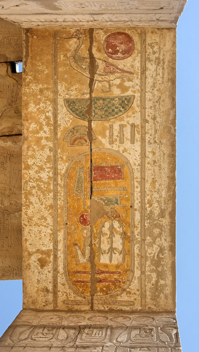 Sous l'architrave, une partie de la titulature de Ramsès II : à gauche, le nom de Roi de Haute et de Basse Egypte dans le cartouche : "Puissante est la Maât de Rê, Celui qui a été choisi par Rê" précédé par la formule "le Maître des Deux Terres".