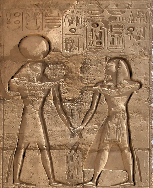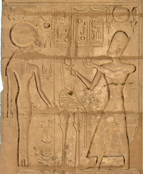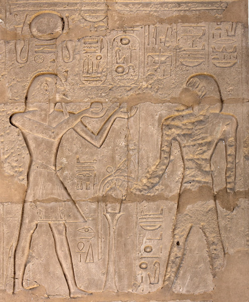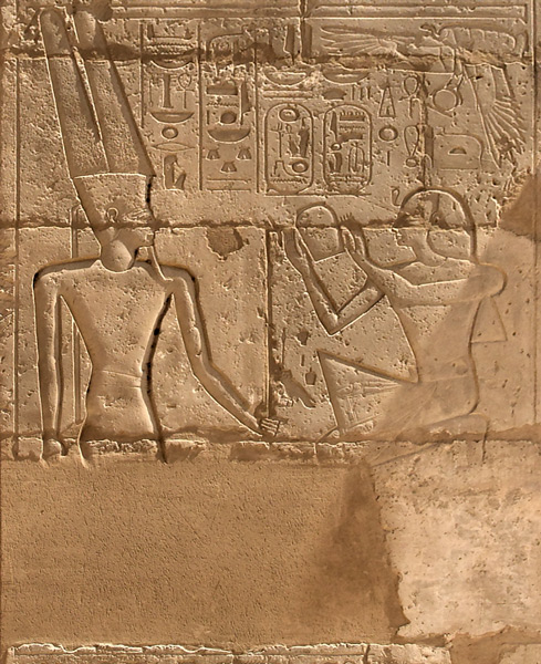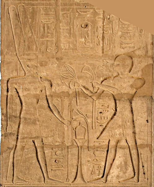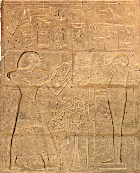 Le roi est agenouillé devant Amon-Rê. Il lui tend le vase Nemset.