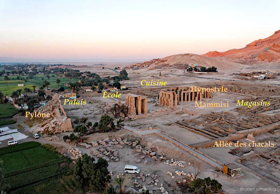L'ensemble couvre 6 hectares. Sur le côté nord du temple, un mammisi lui était associé, à la gloire de sa mère Touy et de sa grande épouse royale Néfertari. Sur le côté sud, se trouvaient le Palais Royal et une Maison de Vie. Ce temple glorifie la force et la vaillance du roi, avec deux descriptions de la Bataille de Qadesh et une description de la bataille de Dapour. La fonction royale y est confirmée par les dieux, lors de plusieurs tableaux, associant des dieux différents. Les représentations diverses de la famille royale consacrent la pérennité de la fonction. Ce temple est également célèbre par son plafond dit astronomique décrivant un calendrier idéal.