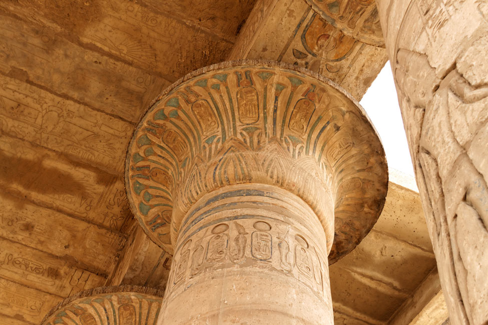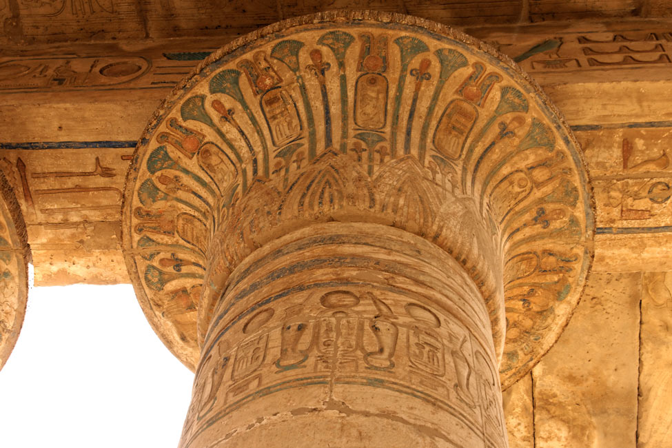 | Les chapiteaux des colonnes centrales du côté Sud sont un peu différentes. Des fleurs de lys sont intercalées dans la succession de fleurs de lotus encadrant les cartouches du roi. | Cliquez ici pour voir le plafond de la salle.
