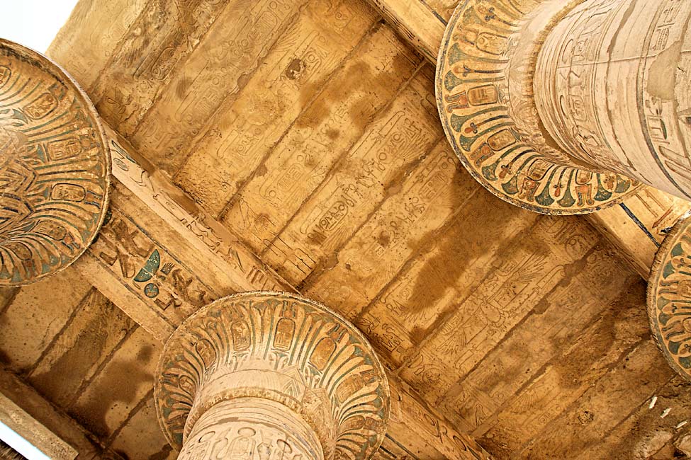 | La différence entre les colonnes Nord et Sud peut se voir sur cette vue qui montre le plafond de la salle hypostyle avec la déesse Nekhbet. Les couleurs de cette salle sont bien préservées suite aux nettoyages des archéologues. | [Retour] Copyright (c) Robert Rothenflug |