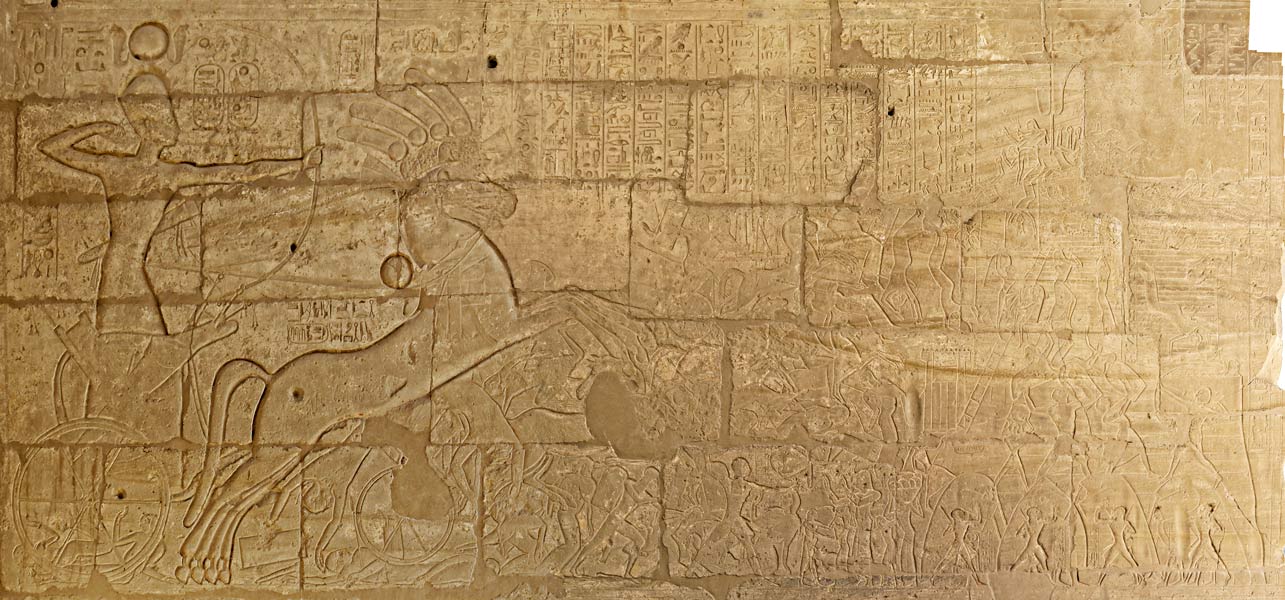 reconquête. Il la fit graver sur un des murs de son temple. Le roi, dressé sur son attelage, décoche des