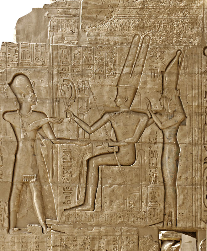 Amon tend les insignes du pouvoir à Ramsès II. Il lui souhaite aussi de nombreuses fêtes sed. Derrière lui, la déesse Mout. Dans la partie qui reste dans l'ombre, des restes de peinture subsistent, sur la robe de Mout et dans les hiéroglyphes à droite. Une autre scène existait sur le mur, dont il reste une déesse derrière le roi.