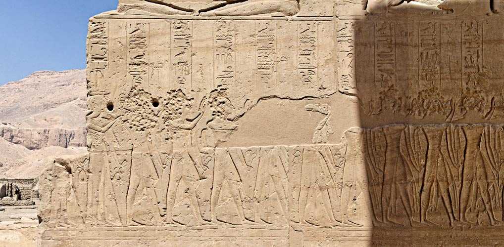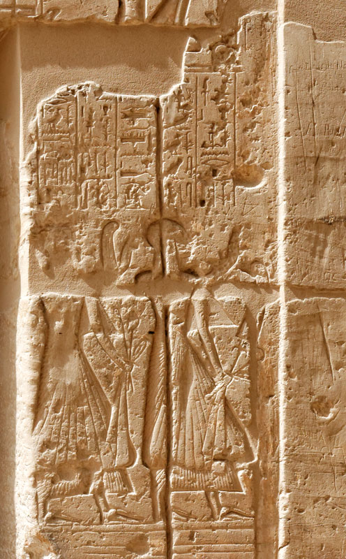 Le défilé a été mutilé à droite par une ouverture effectuée dans le mur . Les noms de cette partie comprennent les fils du numéro 8 au numéro 14. L'avant-dernier sur la gauche est Merenptah, qui a fait apposer son cartouche montré en plus gros plan dans une page spéciale. |