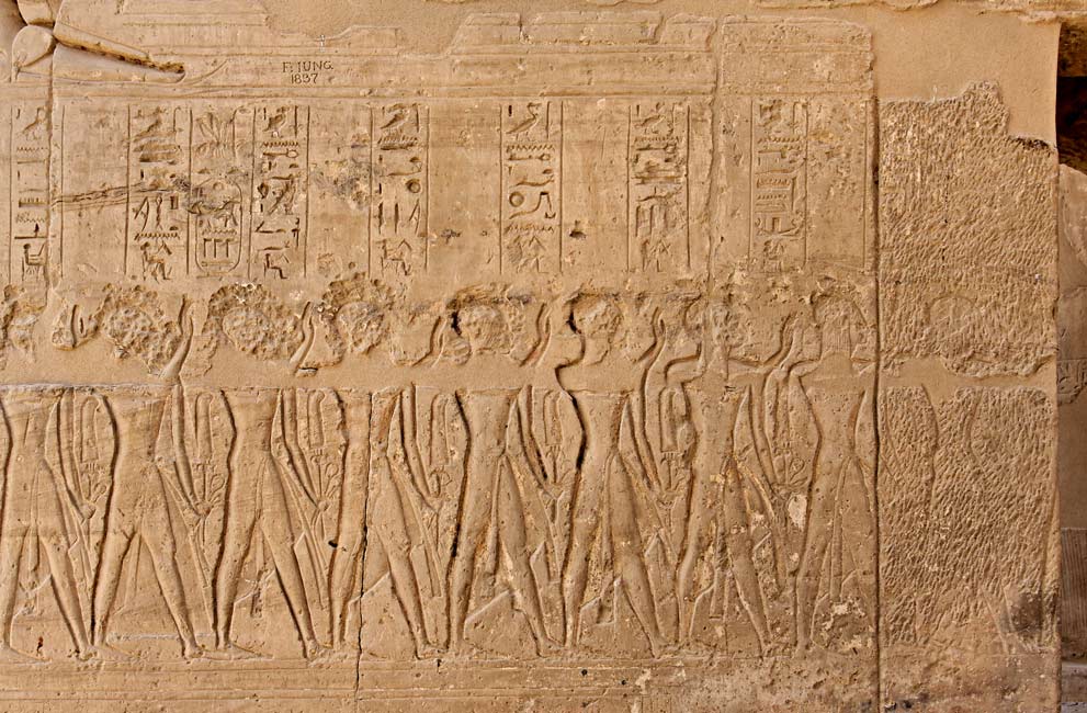 Suite de ce 3ème défilé. Ici les noms sont pratiquement au dessus des figures. La liste s'arrête à Samontou, le 23ème, comme la liste sur le mur opposé. Mais le défilé des princes est suivi d'un défilé des princesses dont il ne reste que la première, sans doute Bentanat.