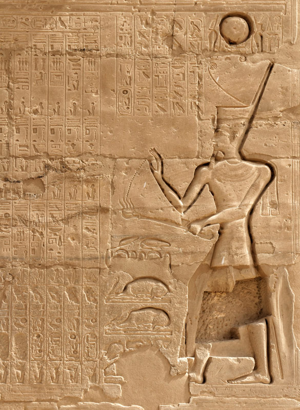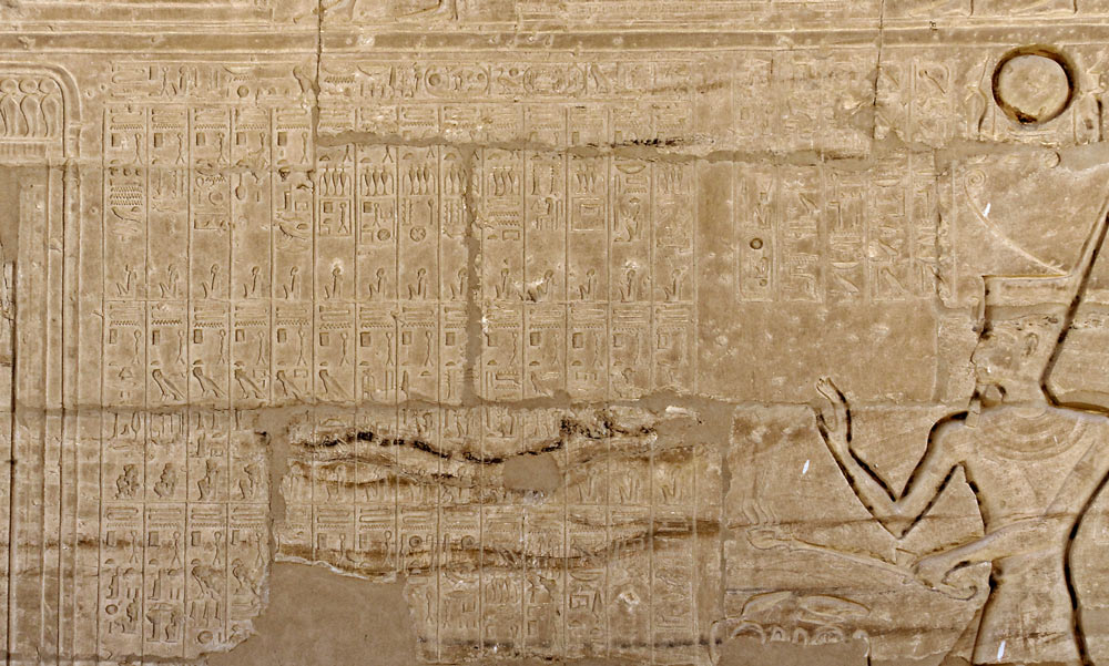 Toutes les litanies concernent Ptah dont le nom est reproduit dans chaque colonne. A la 7ème colonne, en haut, en partant de la gauche, Ptah est dit "qui préside le Chateau du ka de Ptah (le nom de son temple" à Menphis. Dans la colonne suivante, il est dit "qui préside Ineb-hedj (Menphis)".