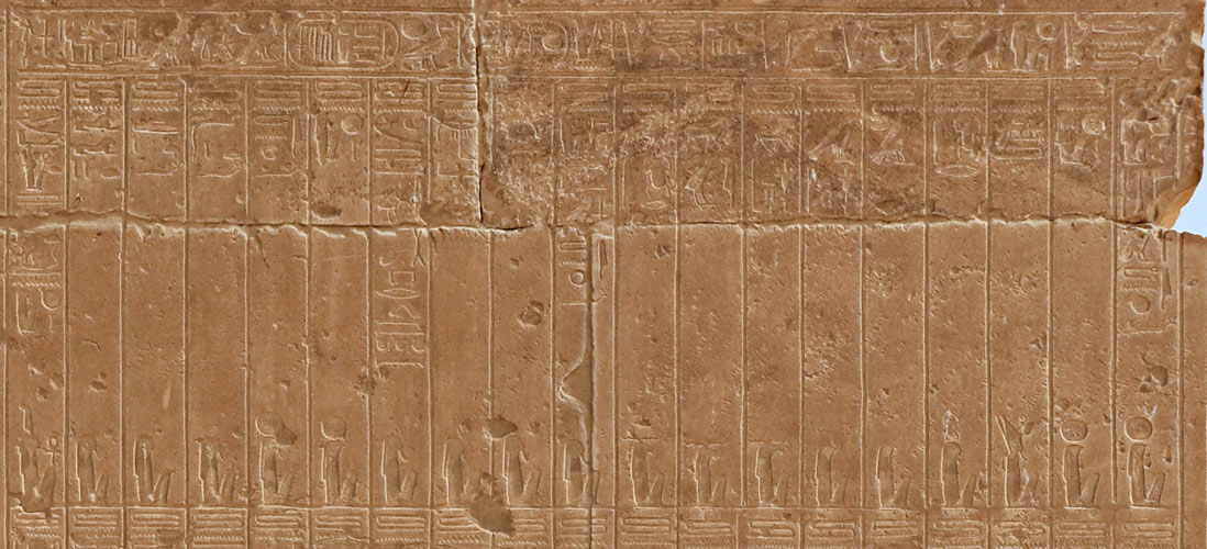 On reconnaît quelques noms de dieux : à droite, Rê qui est dit "dans son disque (iten)", puis Rê, Atoum, ensuite Khépri. Ensuite, Horus des Deux Terres (?) et Horus de l'Orient. Puis Khnoum de l'Orient, un autre Khnoum associé à Chou (dont il est le ba (J.P. Coteggiani,2007)), Rê-Khépri, le soleil naissant. Ensuite le Grand Dieu qui est dans son disque (mieux lisible dans Champollion). L'invocation se termine