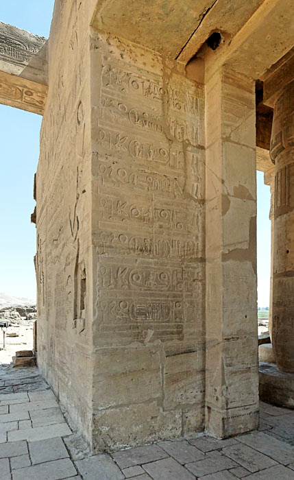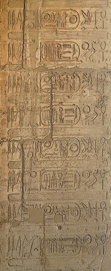 Sur la tranche du mur, la titulature de Ramsès II avec le nom de Roi de Haute et de Basse Égypte en alternance avec le nom de fils de Rê. Derrière chaque cartouche, les inscriptions différent : "Aimé d'Amon-Rê" au début . A la 3ème ligne, on croît reconnaître la silhouette de Seth et à la 4ème le nom de Ptah. A la 6ème ligne : "Aimé de Khonsou", puis "Aimé de Mout" à la fin.