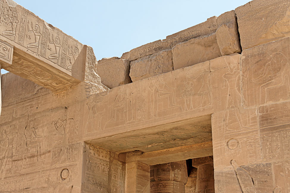 On voit ici le linteau au-dessus de la porte, ainsi que le départ de l'architrave avec des représentations de décans et de planètes. De chaque côté, les scènes du haut des deux murs. Sur le linteau, à gauche, le roi offre de l'encens à Amon et Khonsou et à droite, il verse une libation pour Amon et Mout (Porter et Moss, page 441).