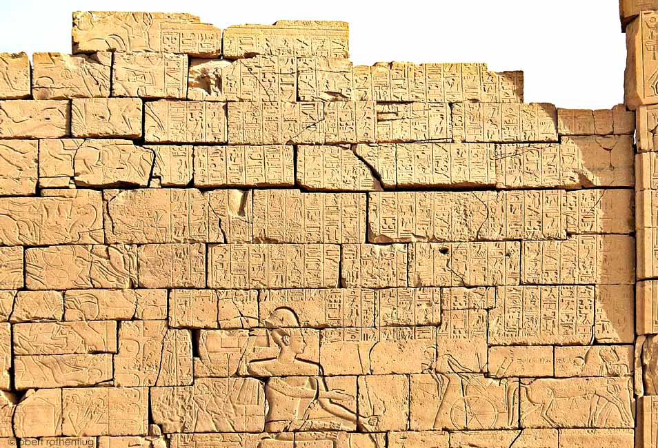 Deux textes relatent la bataille de Qadesh. L'un, le Bulletin, se veut un compte-rendu quasi militaire de la bataille. L'autre, le Poëme de Pentaour, aurait été dicté par Ramsès II lui-même. En fait, les deux font la part belle à Ramsès II. Une version complète du Bulletin est inscrite sur le pylône au-dessus du pharaon.