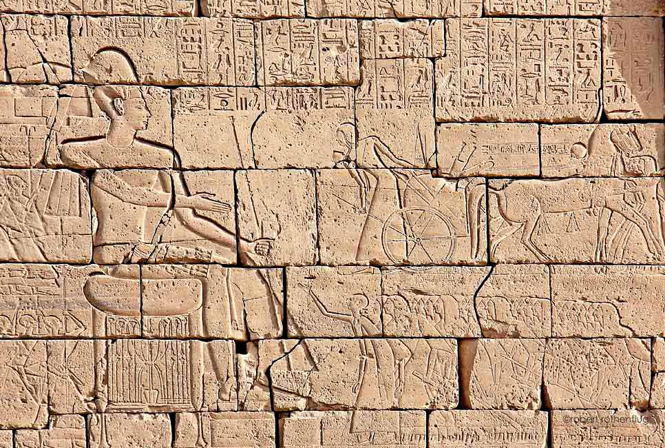 par les troupes du pharaon et sous la bastonnade, ils viennent d'avouer que l'armée du roi hittite est derrière Qadesh et va lancer son attaque. En urgence, Ramsès II réunit son conseil de guerre. Sur son trône, est dessiné le Sema-Touy, lys et papyrus réunis qui évoquent les deux parties constitutives de l' Égypte. En face de lui, son fidèle écuyer Menenna lui