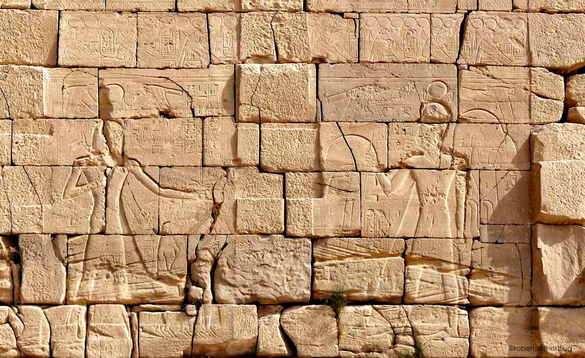 A gauche,lRamsès II tient des captifs par leurs cheveux, dans la posture traditionnelle du pharaon vainqueur. A droite, il tient un bâton de commandement et est éventé par des porteurs d'éventails. On voit que des structures délimitaient les deux représentations : comparant avec Medinet Habou pour lequel Ramsès III avait pris le Ramesseum comme modèle, il pourrait s'agir de départs de colonnades.