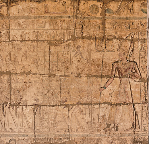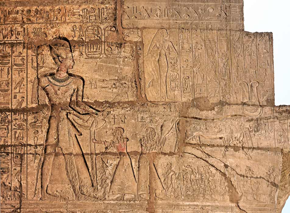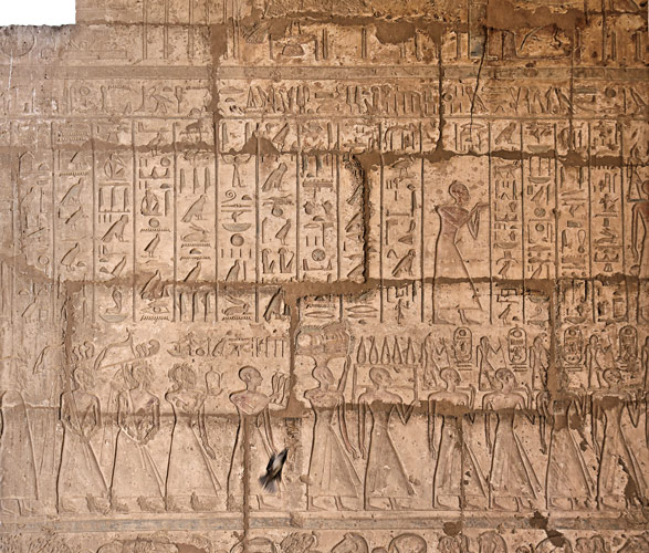 Paroi Est : Ces scènes gravées sur le registre du haut représentent des fêtes liées au dieu Min. Elles avaient lieu durant le premier mois de Chemou, pour marquer le début des moissons. Ici la scène se déroule sur deux registres. Devant le roi, deux prêtres tiennent des pavois. D'autres