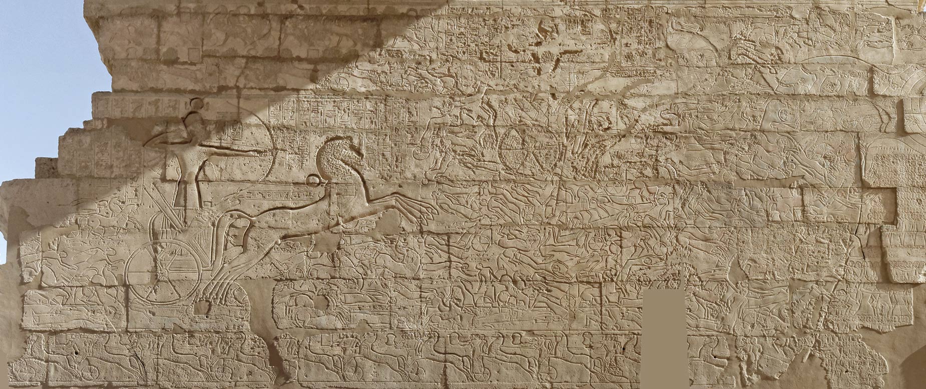 La Bataille de Qadesh : cette vue est une tentative de reconstituer la scène avec 3 photos prises entre les piliers. Les chars hittites ont pénétré dans le camp du pharaon et encerclent le roi. Ramsès II sur son char s'enfonce dans les rangs ennemis et décoche flèche sur flèche. Ses ennemis tombent dans une mêlée effroyable au milieu. A l' extrême droite, on devine la ville de Qadesh entouré par l'Oronte et un canal. Les rives de l'Oronte sont représentées à droite par deux grands traits. Le fleuve charrie des soldats ennemis. Certains sont tirés hors de l'eau par des soldats de l'infanterie et sont sauvés de la noyade. [retour vers le format classique] |