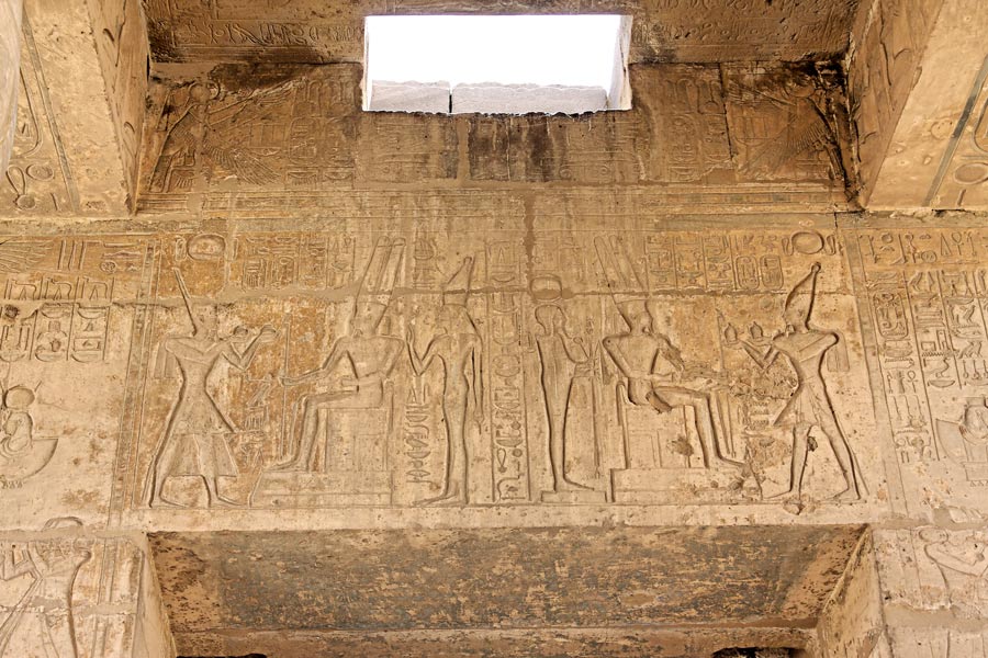 Cette décoration se trouve au dessus de la porte du mur Est. À droite, Ramsès offre deux vases à Amon-Rê et Khonsou. A gauche, il présente des vases remplis de vin à Amon-Rê et Mout.