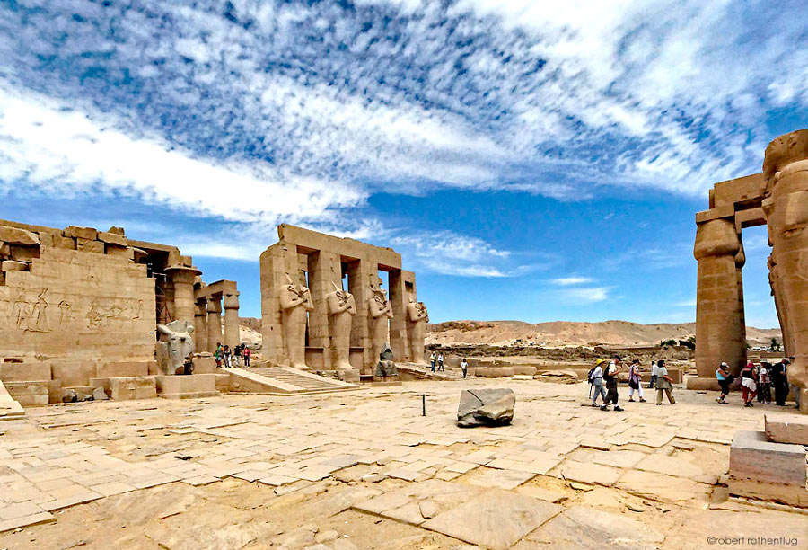 La cour était bordée sur les côtés est et ouest par des piliers osiriaques dont on voit les bases carrées des pylones de soutien au sol. Les autres côtés étaient bordés de 2 rangées de colonnes. À droite, le 2ème pylône (présenté par ailleurs) avec la représentation de la bataille de Qadesh qui était complétée au nord probablement par la partie décrivant le camp de Ramsès. En face, les piliers osiriaques. Deux restes de belles statues de Ramsès II subsistent : une tête posée sur le sol à droite et à gauche le bas d'une statue dite du Jeune Memnon dont la partie supérieure se trouve au British Museum (voir la partie sur les statues). À gauche, au sud-ouest de la cour, se trouve un pan de mur avec une belle représentation d'une montée royale et d'un couronnement complétée par le premier défilé des fils de Ramsès.