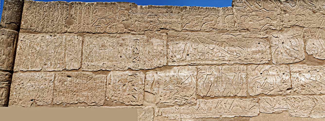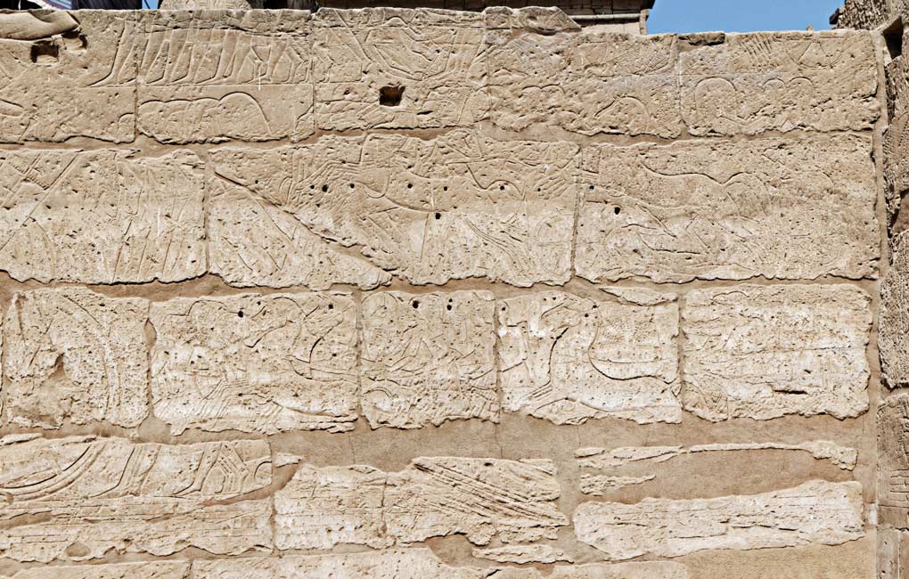 En haut, l'armée de Ramsès II est en train de remporter la victoire sur les Syriens de la ville de Satouna. Certains sont sur leur char, d'autres à pied.