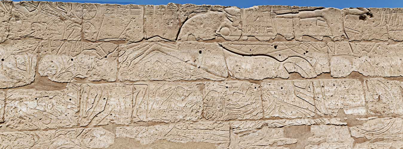 Debout sur son char, Ramsès II décoche des flèches vers ses ennemis. Le chef ennemi (représenté devant le char de Ramsès II) est touché.