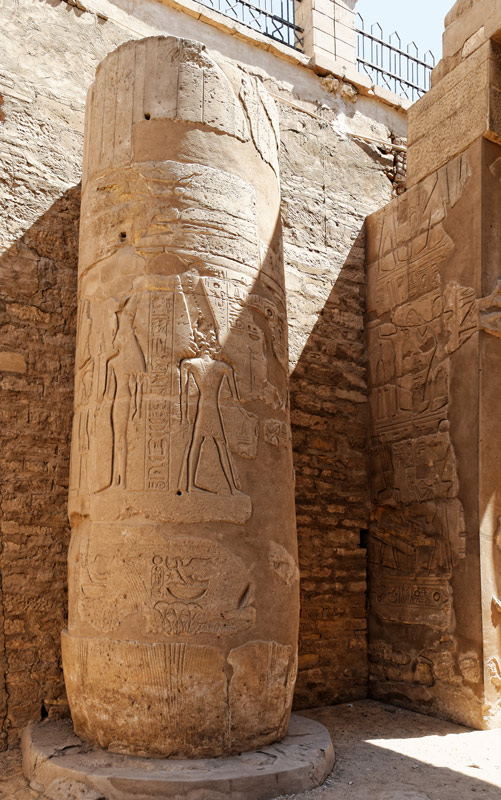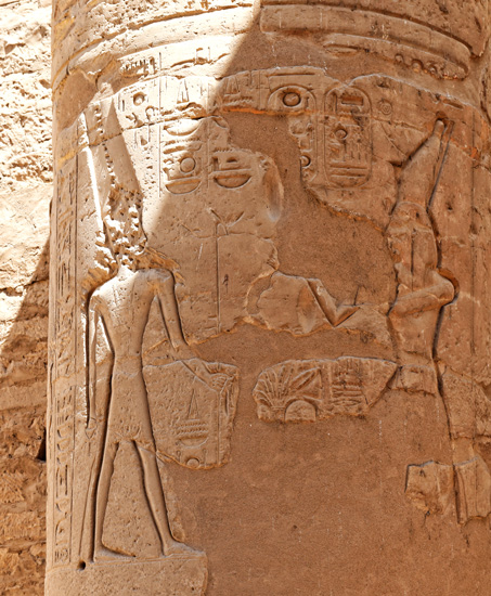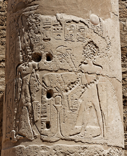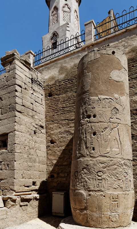 Sur la 2ème colonne, , Ramsès II offre un bouquet à Amon. A gauche, une construction qui s'appuie sur le mur de fondation de la mosquée.