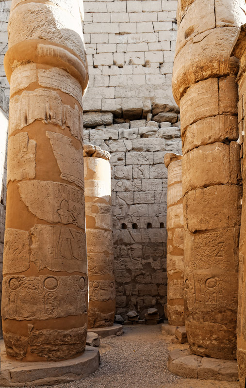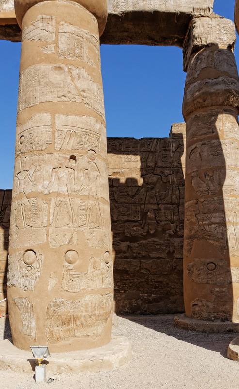 Les dernières colonnes de cette colonnade aboutissent au pylône. Les 2 colonnes à droite sont prises dans le mur de la chapelle de Mout. Dans le fond, une scène d'offrandes sur le pylône.