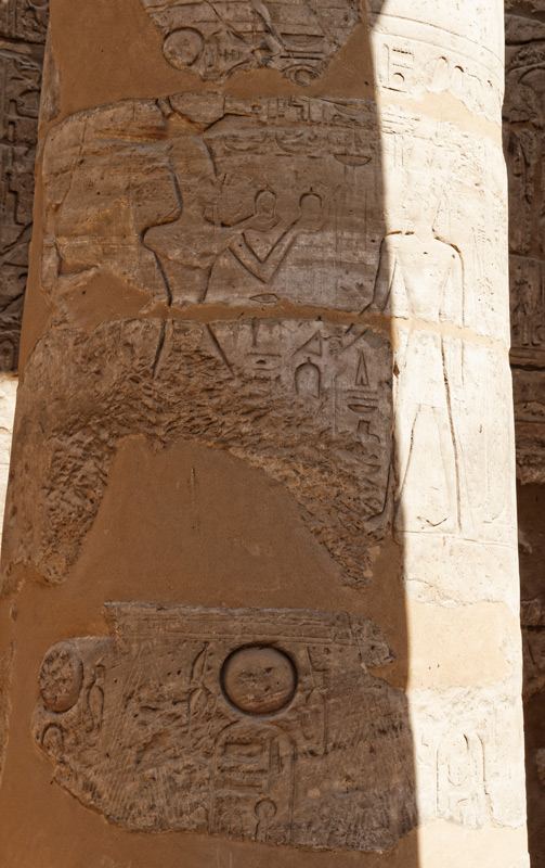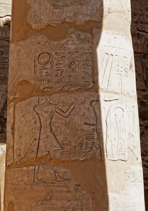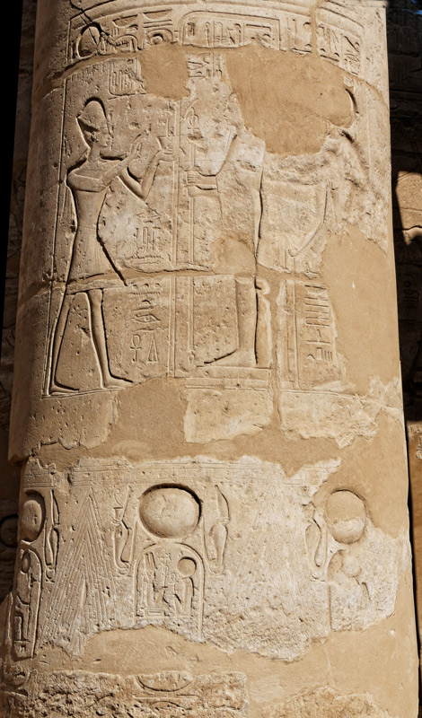 Les colonnes sont décorées de scènes d'offrandes et de frises avec les noms de Ramsès II. Sur la colonne de devant, Ramsès II encense Amon-Rê et Khonsou. Pour la colonne arrière, à droite de l'image, voir ci-contre.