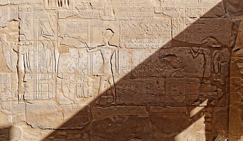 Scène de la paroi Est : le roi encense(purifie) une statue d'Amon. Amon est représenté ithyphallique comme Min. Derrière lui, un jardin avec les salades romains de Min. Il donne au roi bravoure et victoire. Devant le dieu, un petit roi est agenouillé.