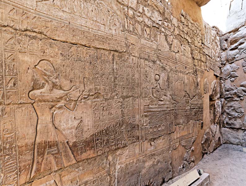 Vue de la chapelle de Khonsou, côté Ouest : on voit que le mur du fond est très abîmé.