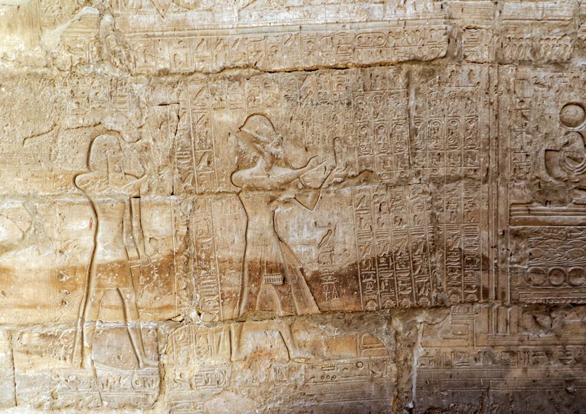 Le roi suivi de Thot tenant une palette fait une offrande d'onguent à la barque de Khonsou.