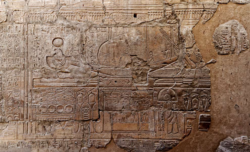 La barque de Khonsou repose sur son socle. 2 petits rois soutiennent le naos.