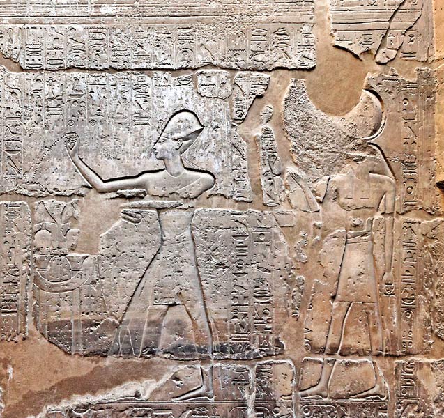 | Suivi de Khonsou, le roi lance des boulettes (encens?, natron?) de la main droite dans une coupelle qu'il tient de la main gauche pour purifier. |