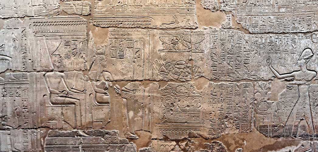 Une grande table d'offrandes est posé devant Mout et la déesse Neith assises sur des trônes.